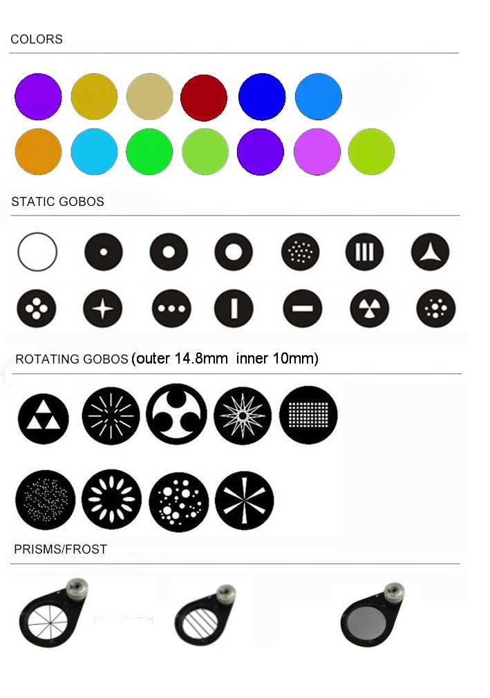 FEATURESColor wheels: 13 colors +Open Static gobo wheel: 13 fixed metal gabos + Open Rotating gobo wheel: 9 exchangeable glass gobos + 0pen Outer 14.8mm; inner 10mm Prism wheel: 8-facet circular ratating prism and 4-facet linear prism Zoom: 3°-30° motorized zoom Dimmer: 0-100% linear dimming system